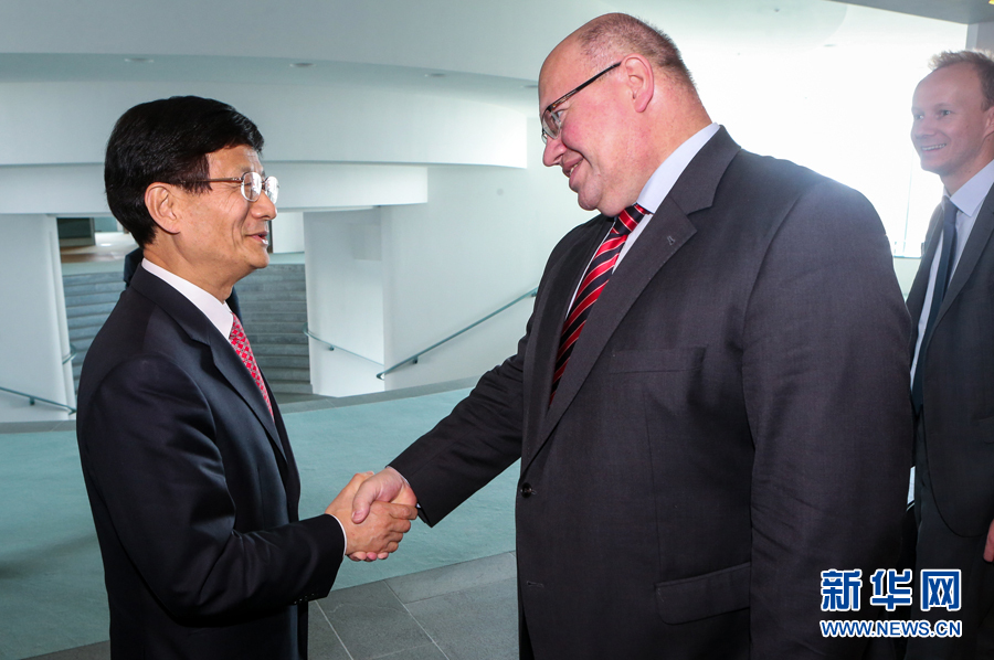 ??? 6月29日,習(xí)近平主席特使、中共中央政治局委員、中央政法委書記孟建柱(左)在德國(guó)首都柏林會(huì)見(jiàn)德國(guó)總理府部長(zhǎng)阿爾特邁爾。新華社記者張帆攝