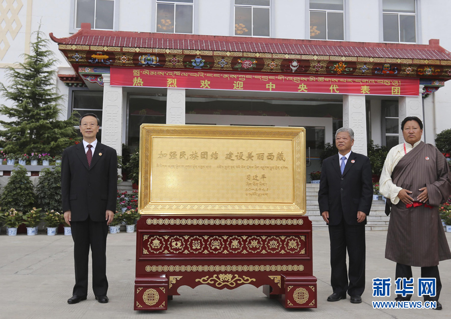 ??? 9月9日至10日,中央書記處書記、全國(guó)政協(xié)副主席、中央代表團(tuán)副團(tuán)長(zhǎng)杜青林率林芝分團(tuán),帶著以習(xí)近平同志為總書記的黨中央對(duì)西藏各族人民的深切關(guān)懷和全國(guó)人民的美好祝福,看望慰問(wèn)當(dāng)?shù)馗髯甯刹咳罕?。這是9月10日,杜青林向林芝市贈(zèng)送習(xí)近平總書記題詞“加強(qiáng)民族團(tuán)結(jié) 建設(shè)美麗西藏”賀匾。 新華社記者丁林?jǐn)z