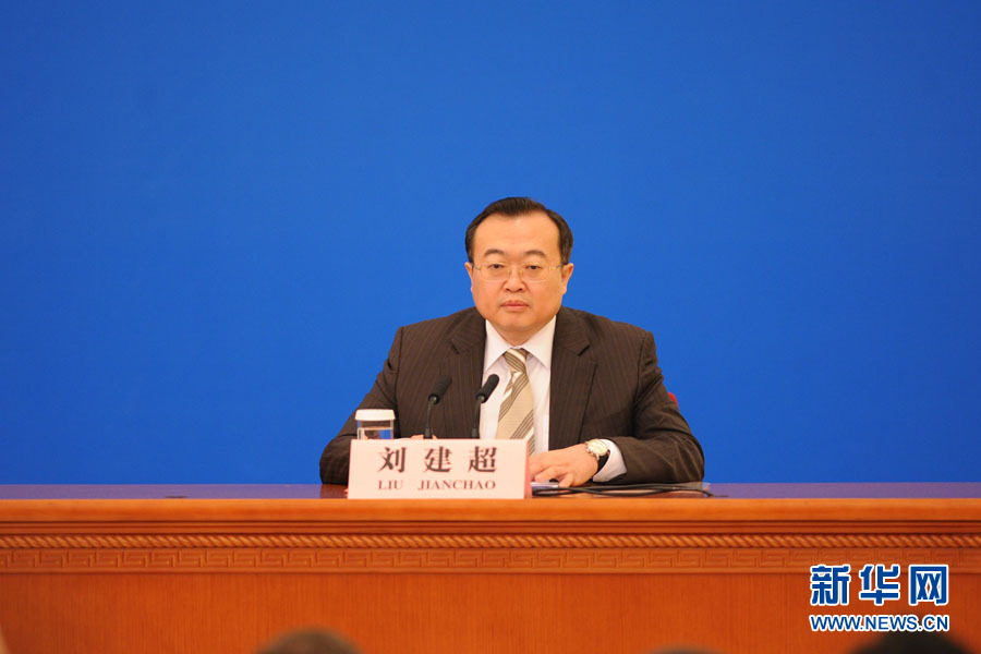 ????3月15日,國務(wù)院總理李克強在人民大會堂三樓金色大廳會見采訪十二屆全國人大三次會議的中外記者并回答記者提出的問題。圖為外交部部長助理兼新聞司司長劉建超。新華網(wǎng)/中國政府網(wǎng) 翟子赫 攝