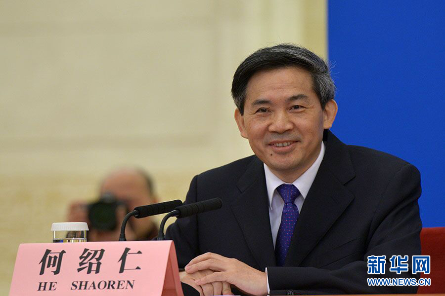 ????3月15日,國務(wù)院總理李克強在人民大會堂三樓金色大廳會見采訪十二屆全國人大三次會議的中外記者并回答記者提出的問題。圖為全國人大常委會辦公廳新聞局局長何紹仁。新華網(wǎng)/中國政府網(wǎng)?郭小天 攝