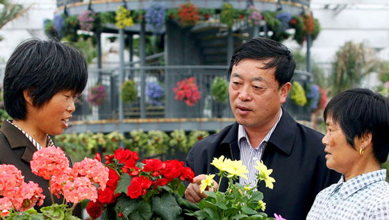武繼軍(中)和花農(nóng)交流花卉培育經(jīng)驗(yàn)。