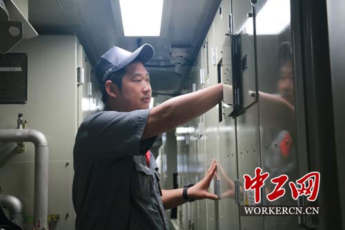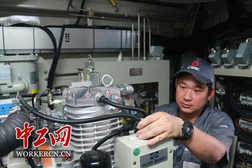 張如意在調(diào)試“和諧號(hào)”空氣壓縮機(jī)。中工網(wǎng)記者 葛文琦攝