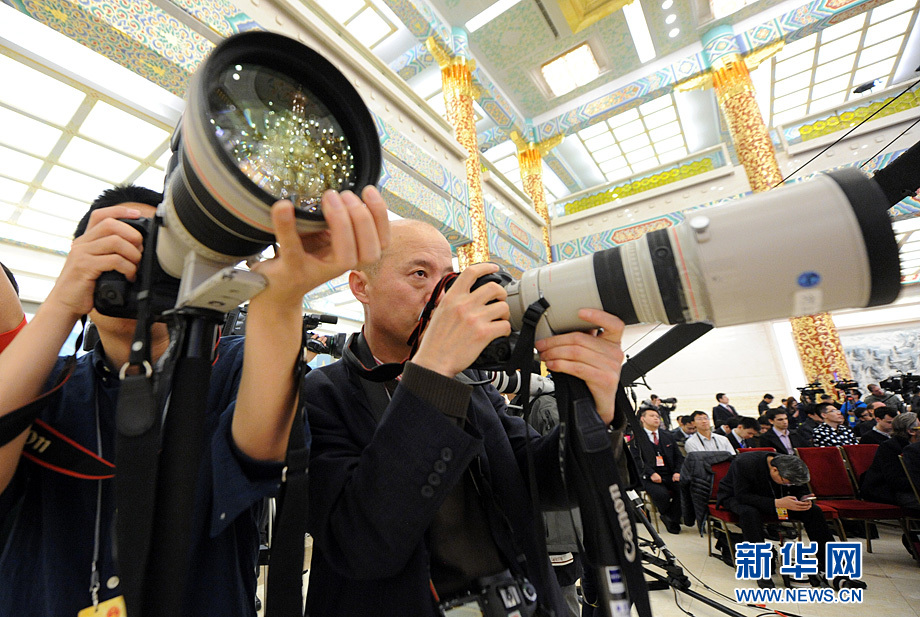 3月16日上午,國務(wù)院總理李克強(qiáng)在人民大會(huì)堂三樓金色大廳會(huì)見采訪十二屆全國人大四次會(huì)議的中外記者并回答記者提出的問題。圖為記者用多鏡頭拍攝記者會(huì)。新華網(wǎng)/中國政府網(wǎng) 陳競超 攝
