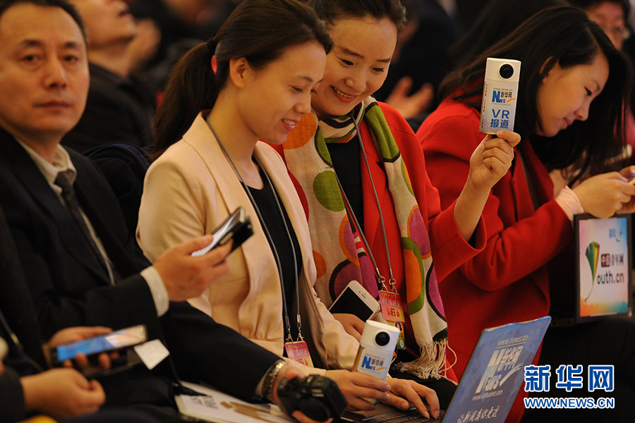 3月16日上午,國務(wù)院總理李克強(qiáng)在人民大會(huì)堂三樓金色大廳會(huì)見采訪十二屆全國人大四次會(huì)議的中外記者并回答記者提出的問題。圖為新華網(wǎng)記者用VR報(bào)道總理記者會(huì)現(xiàn)場(chǎng)。新華網(wǎng)/中國政府網(wǎng) 陳杰攝