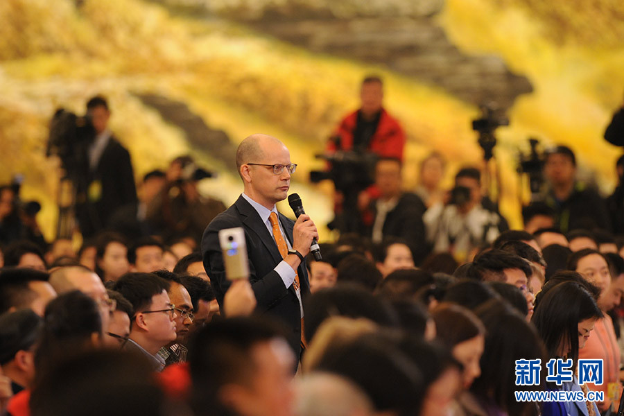 3月16日上午,國務(wù)院總理李克強在人民大會堂三樓金色大廳會見采訪十二屆全國人大四次會議的中外記者并回答記者提出的問題。圖為彭博新聞社記者提問。新華網(wǎng)/中國政府網(wǎng) 陳杰攝