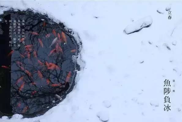 再過(guò)五日,河里的冰開(kāi)始融化,魚(yú)開(kāi)始到水面上游動(dòng),此時(shí)水面上還有沒(méi)完全溶解的碎冰片,如同被魚(yú)負(fù)著一般浮在水面。