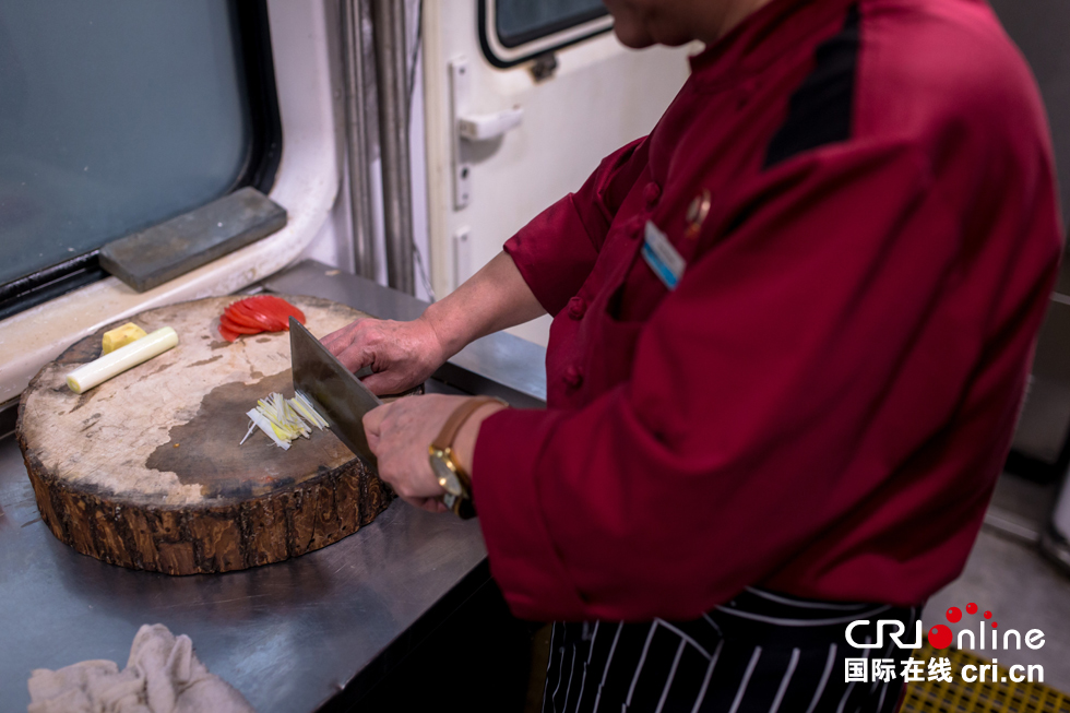 列車上的廚師和一般的餐廳廚師最大的區(qū)別在于“晃”,火車在運行中顛簸不斷,“最重要的是腿要分開,站成外八字,扎好馬步,隨著車廂晃動的方向,這樣才能穩(wěn)當?!卑讕煾嫡f。