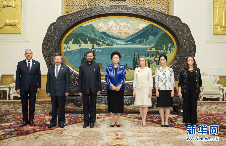 7月5日,國務(wù)院副總理劉延東在北京人民大會堂會見第五屆金磚國家教育部長會議外方代表團團長。 新華社記者 李濤 攝