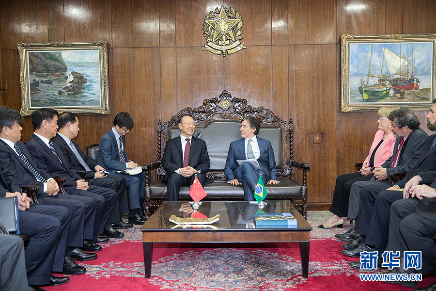 7月11日,在巴西首都巴西利亞,中共中央書記處書記、全國政協(xié)副主席杜青林(中左)會見巴西參議院議長歐尼西奧·奧利維拉(中右)。新華社記者李明攝