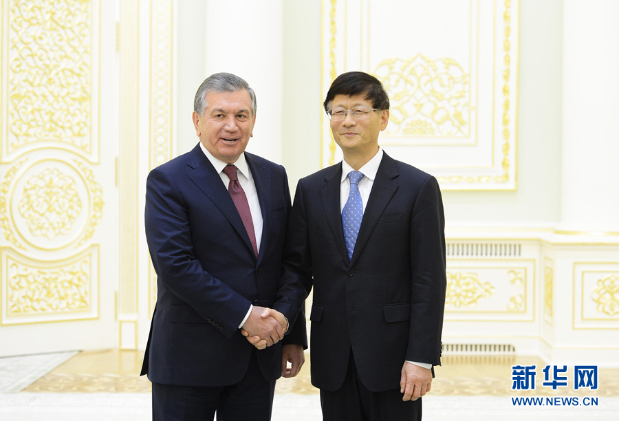 9月9日,中共中央政治局委員、中央政法委書記、中國(guó)和烏茲別克斯坦政府間合作委員會(huì)中方主席孟建柱(右)在塔什干會(huì)見烏總統(tǒng)米爾濟(jì)約耶夫?! ⌒氯A社記者沙達(dá)提攝