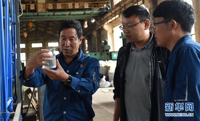 云南冶金昆明重工有限公司首席技師耿家盛(左)在車間里和助手查看生態(tài)環(huán)保廁所的沖水系統(tǒng)經過循環(huán)后的水質(9月22日攝)。新華社記者 藺以光 攝