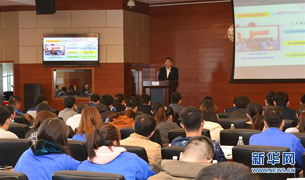 在國(guó)網(wǎng)天津?yàn)I海公司,張黎明在“十九大代表與國(guó)資系統(tǒng)青年面對(duì)面宣講會(huì)”上宣講十九大精神(11月10日攝)。 新華社發(fā)