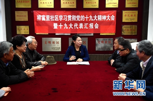 10月26日,陳林靜(中)在祥富里社區(qū)為居民宣講黨的十九大精神。新華社記者 王曉 攝