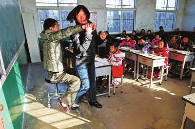 這節(jié)課,學(xué)生們聽得很認真。45分鐘的課程很快過去,下課后,妻子又把曹老師背了下來?!拔覀儛鄄芙處煛!卑嗬镌S多小朋友告訴記者。