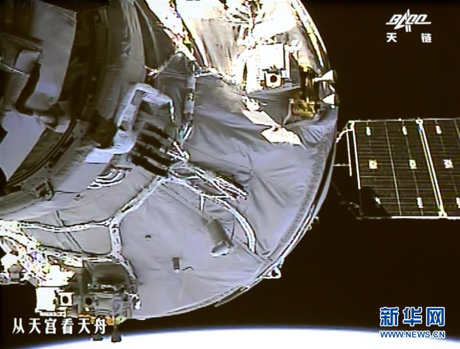4月22日,北京航天飛行控制中心大廳大屏幕顯示天舟一號與天宮二號自動交會對接畫面。這是天舟一號與天宮二號進(jìn)行的首次自動交會對接,也是我國自主研制的貨運飛船與空間實驗室的首次交會對接。(新華社發(fā)王泗江 攝)