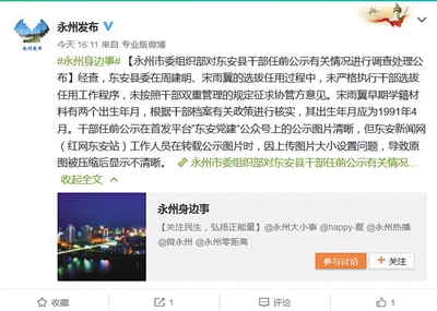 新京報(bào)此前報(bào)道,12月10日,湖南東安縣組織部發(fā)布的一份“干部簡(jiǎn)歷公示”通告引發(fā)廣泛質(zhì)疑。多名永州當(dāng)?shù)鼐W(wǎng)友發(fā)文稱(chēng),名單中擬提拔人員簡(jiǎn)歷,其中有干部工作經(jīng)歷存在疑點(diǎn)。