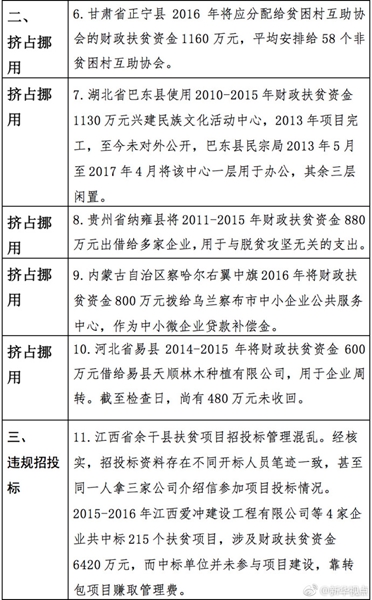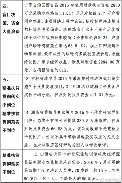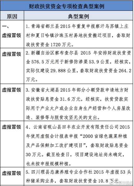 “發(fā)現(xiàn)一起、查處一起、絕不姑息!”財政部監(jiān)督檢查局有關(guān)負(fù)責(zé)人指出,此次檢查發(fā)現(xiàn)了一批違法違規(guī)問題,本著“零容忍”態(tài)度已進(jìn)行了嚴(yán)肅處理。從檢查發(fā)現(xiàn)問題中的一些典型案例看,虛報冒領(lǐng)、擠占挪用、違規(guī)招投標(biāo)、盲目決策導(dǎo)致資金大量浪費(fèi)、精準(zhǔn)扶貧貫徹落實(shí)不到位是當(dāng)前濫用扶貧資金的主要問題所在。