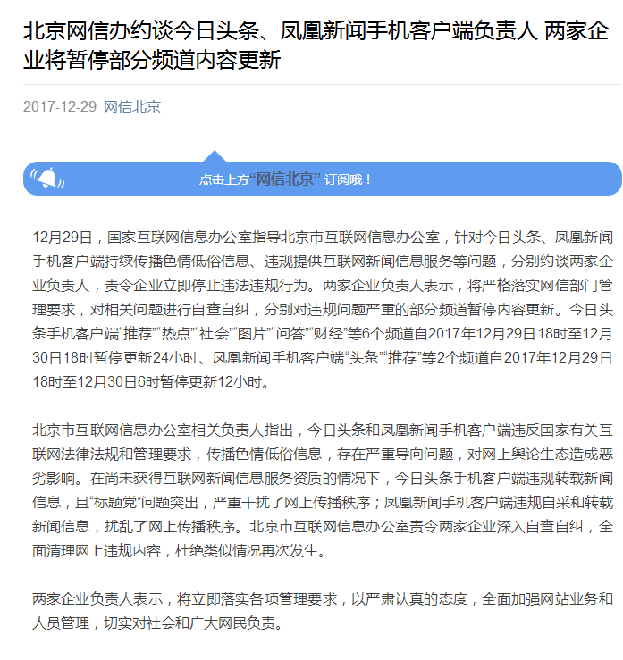 原標(biāo)題:北京網(wǎng)信辦約談今日頭條、鳳凰新聞手機(jī)客戶端負(fù)責(zé)人 兩家企業(yè)將暫停部分頻道內(nèi)容更新