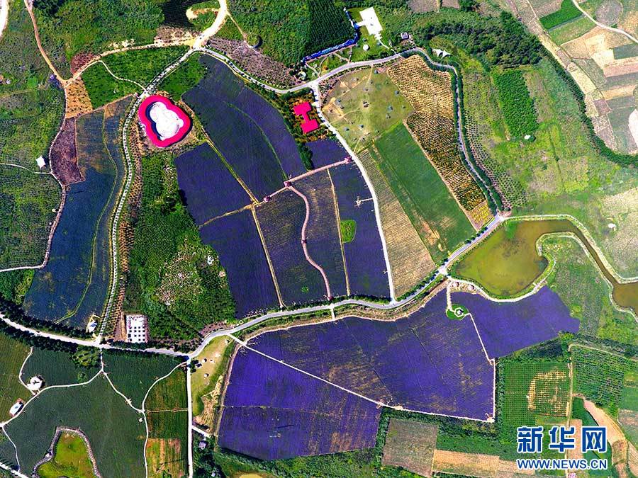 這是5月26日航拍的廣西忻城縣薰衣草莊園。通過農(nóng)業(yè)、文化、旅游的深度融合,從農(nóng)業(yè)供給側(cè)改革上精準發(fā)力,忻城走出了一條以農(nóng)業(yè)產(chǎn)業(yè)創(chuàng)新帶動第三產(chǎn)業(yè)發(fā)展的道路。新華社記者 黃孝邦 攝