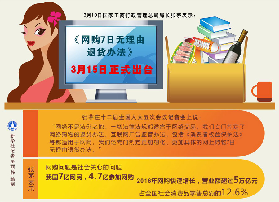 圖表:《網(wǎng)購(gòu)7日無(wú)理由退貨辦法》3月15日正式出臺(tái) 新華社記者 孟麗靜 編制
