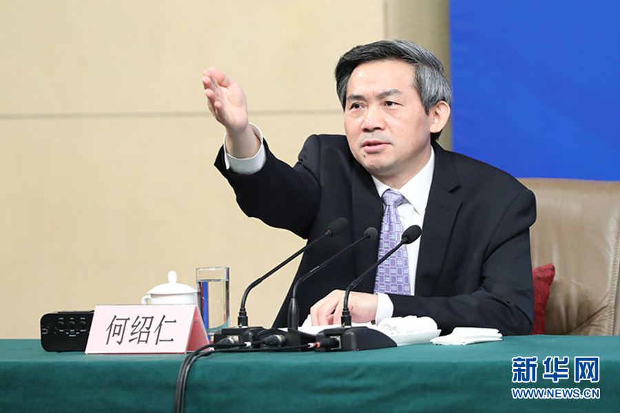 3月11日,十二屆全國(guó)人大五次會(huì)議新聞中心舉行記者會(huì),主題是“改革開(kāi)放調(diào)結(jié)構(gòu) 創(chuàng)新驅(qū)動(dòng)促發(fā)展”,商務(wù)部部長(zhǎng)鐘山、副部長(zhǎng)王受文、副部長(zhǎng)錢(qián)克明出席并回答中外記者的提問(wèn)。圖為記者會(huì)主持人何紹仁。 新華網(wǎng)/中國(guó)政府網(wǎng) 傅義洲 攝