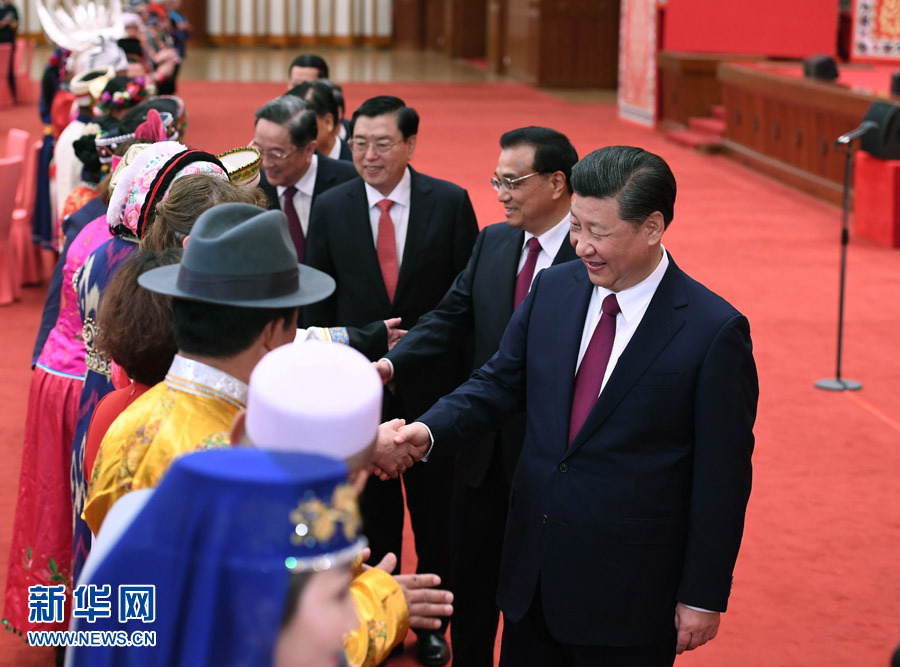 3月11日晚,中共中央統(tǒng)戰(zhàn)部、全國人大民族委員會、國家民族事務(wù)委員會、全國政協(xié)民族和宗教委員會在北京人民大會堂舉行茶話會,黨和國家領(lǐng)導(dǎo)人習(xí)近平、李克強(qiáng)、張德江、俞正聲、劉云山、王岐山、張高麗等與出席十二屆全國人大五次會議和全國政協(xié)十二屆五次會議的少數(shù)民族代表委員們歡聚一堂,共慶全國兩會勝利召開,共祝偉大祖國繁榮昌盛,共話中華民族美好未來。新華社記者 李學(xué)仁 攝