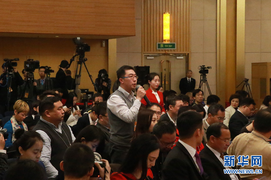 3月14日,十二屆全國人大五次會議新聞中心舉行記者會,邀請國家質檢總局局長支樹平、副局長兼國家認證認可監(jiān)督管理委員會主任孫大偉、國家標準化管理委員會主任田世宏就“質量提升”的相關問題回答中外記者的提問。圖為中國食品安全報記者提問。新華網/中國政府網 傅義洲 攝?