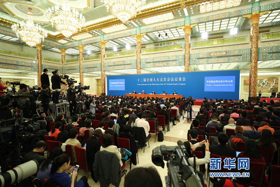 3月15日上午,國務院總理李克強在人民大會堂三樓金色大廳會見采訪十二屆全國人大五次會議的中外記者并回答記者提出的問題。圖為記者會現(xiàn)場。新華網(wǎng)/中國政府網(wǎng) 翟子赫 攝?