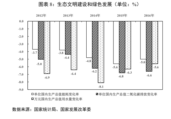 ?。ㄆ撸┘訌?qiáng)生態(tài)環(huán)境保護(hù)和能源資源節(jié)約,綠色發(fā)展初見成效。單位國內(nèi)生產(chǎn)總值能耗和二氧化碳排放量分別下降5%和6.6%,超額完成全年目標(biāo),化學(xué)需氧量、氨氮、二氧化硫、氮氧化物排放量預(yù)計分別下降2.6%、2.9%、5.6%、4.0%,地級及以上城市空氣質(zhì)量優(yōu)良天數(shù)比例同比提高2.1個百分點(diǎn),74個重點(diǎn)城市細(xì)顆粒物(PM2.5)年均濃度下降9.1%,地表水達(dá)到或好于Ⅲ類水體比例同比提高1.8個百分點(diǎn)、劣Ⅴ類水體比例同比下降1.1個百分點(diǎn),萬元國內(nèi)生產(chǎn)總值用水量下降5.6%。