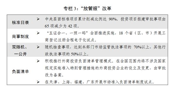 一是簡政放權(quán)放管結(jié)合優(yōu)化服務(wù)改革向縱深推進(jìn)。在提前完成本屆政府減少行政審批事項(xiàng)三分之一目標(biāo)的基礎(chǔ)上,去年又取消165項(xiàng)國務(wù)院部門及其指定地方實(shí)施的審批事項(xiàng),清理規(guī)范192項(xiàng)審批中介服務(wù)事項(xiàng)、220項(xiàng)職業(yè)資格許可認(rèn)定事項(xiàng)。第三次修訂政府核準(zhǔn)的投資項(xiàng)目目錄。商事制度改革繼續(xù)深化。全面推行“雙隨機(jī)、一公開”,增強(qiáng)事中事后監(jiān)管的有效性,推進(jìn)“互聯(lián)網(wǎng)+政務(wù)服務(wù)”。市場準(zhǔn)入負(fù)面清單制度改革試點(diǎn)開局良好。“放管服”四大平臺建成運(yùn)行。