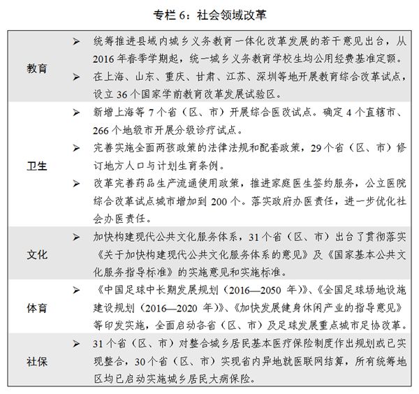 七是社會領(lǐng)域改革加快推進(jìn)。中央和國家機(jī)關(guān)公務(wù)用車制度改革全面完成,地方黨政機(jī)關(guān)公車改革深入推進(jìn)。行業(yè)協(xié)會商會與行政機(jī)關(guān)脫鉤改革第二批試點(diǎn)啟動實(shí)施。加快不動產(chǎn)統(tǒng)一登記制度落地,全國100%的地(市、州)、98%的縣(市、區(qū))實(shí)現(xiàn)“發(fā)新停舊”。國家科技計劃管理改革繼續(xù)深化,以增加知識價值為導(dǎo)向的分配政策出臺,科技成果轉(zhuǎn)化力度加大。教育領(lǐng)域綜合改革向縱深推進(jìn)。分級診療制度建設(shè)持續(xù)推進(jìn),城鄉(xiāng)居民基本醫(yī)療保險制度整合取得實(shí)質(zhì)性進(jìn)展,個人衛(wèi)生支出占衛(wèi)生總費(fèi)用的比重下降到28.9%?!秶鴦?wù)院辦公廳關(guān)于全面放開養(yǎng)老服務(wù)市場提升養(yǎng)老服務(wù)質(zhì)量的若干意見》(國辦發(fā)〔2016〕91號)印發(fā)實(shí)施。穩(wěn)步推進(jìn)機(jī)關(guān)事業(yè)單位養(yǎng)老保險制度改革。加快構(gòu)建中國特色哲學(xué)社會科學(xué),實(shí)施哲學(xué)社會科學(xué)創(chuàng)新工程。足球改革加快推進(jìn)。