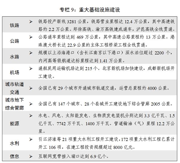 六是基礎(chǔ)設(shè)施網(wǎng)絡(luò)進(jìn)一步完善。加快推進(jìn)現(xiàn)代綜合交通運(yùn)輸體系建設(shè),交通基礎(chǔ)設(shè)施網(wǎng)絡(luò)總里程突破500萬公里。交通提質(zhì)增效、扶貧脫貧、重大基礎(chǔ)設(shè)施建設(shè)“一二三百”工程出臺實(shí)施,推進(jìn)多式聯(lián)運(yùn)發(fā)展,促進(jìn)通用航空業(yè)發(fā)展,推動交通物流融合發(fā)展。能源生產(chǎn)和消費(fèi)革命戰(zhàn)略出臺,能源供應(yīng)能力不斷增強(qiáng),非化石能源消費(fèi)比重預(yù)計上升到13.3%,煤炭消費(fèi)比重下降到62.0%。全國地級市基本建成光網(wǎng)城市,新一代信息基礎(chǔ)設(shè)施更加完善,建成全球最大的4G網(wǎng)絡(luò)。