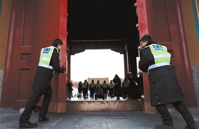 昨日,故宮,保安在進(jìn)行2017年最后一天的晚清場(chǎng)封門(mén)。新京報(bào)記者 浦峰 攝