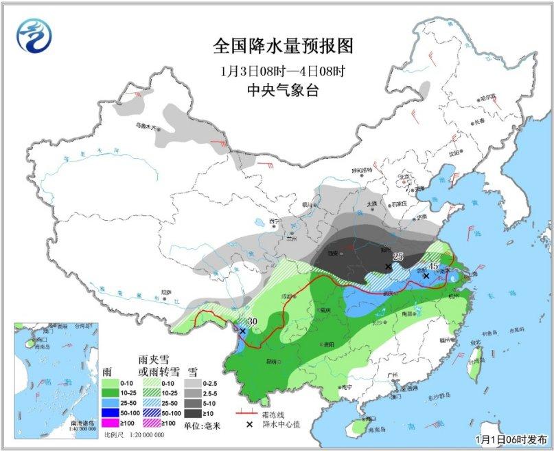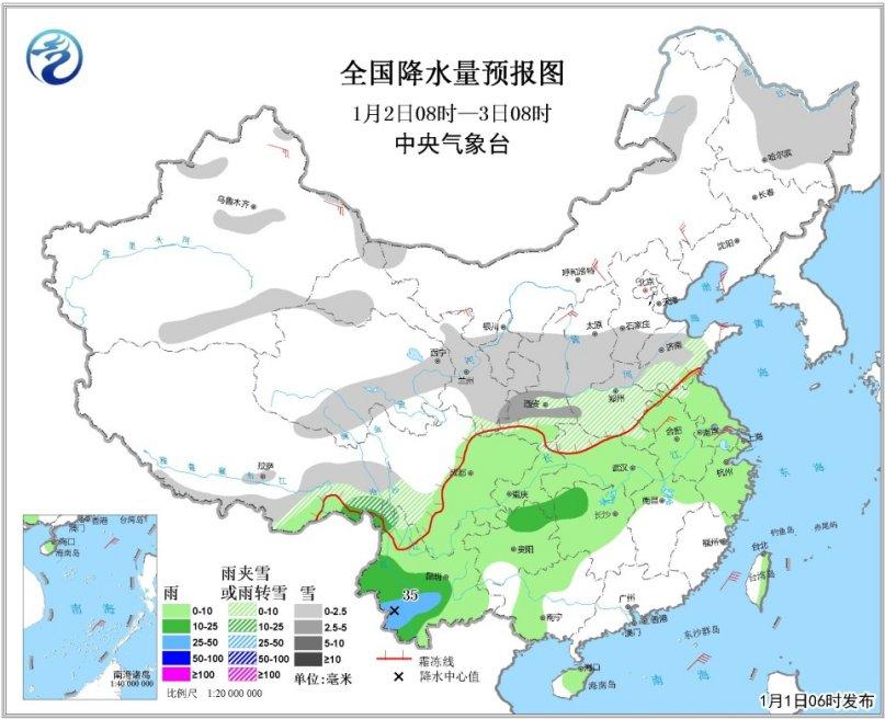 2日08時(shí)至3日08時(shí),中東部有大范圍雨雪天氣。西藏東部、青海東部和南部、西北地區(qū)東部、華北南部、黃淮大部等地有小到中雪或雨夾雪;西南地區(qū)大部、江漢、黃淮東南部、江淮、江南北部、廣西西部等地有小到中雨,其中云南西南部的部分地區(qū)有大雨;內(nèi)蒙古中西部、遼東半島、黃淮東部、江淮東部等地有4~6級(jí)風(fēng)。南海東部有6~8級(jí)、陣風(fēng)9~10級(jí)大風(fēng)。