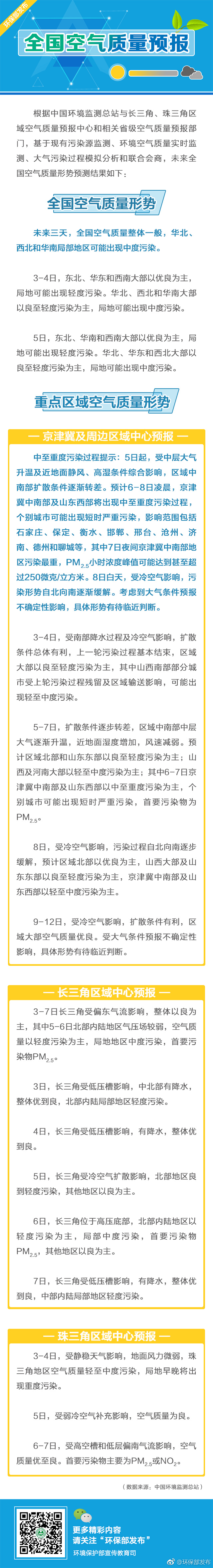 據(jù)環(huán)境保護(hù)部宣傳教育司官方微博消息,未來三天(1月3日-5日),全國空氣質(zhì)量整體一般,華北、西北和華南局部地區(qū)可能出現(xiàn)中度污染。5日起,京津冀及周邊區(qū)域中南部擴(kuò)散條件逐漸轉(zhuǎn)差。預(yù)計6-8日凌晨,京津冀中南部及山東西部將出現(xiàn)中至重度污染過程,個別城市可能出現(xiàn)短時嚴(yán)重污染,其中7日夜間中南部地區(qū)污染最重。8日白天,受冷空氣影響,污染形勢自北向南逐漸緩解。