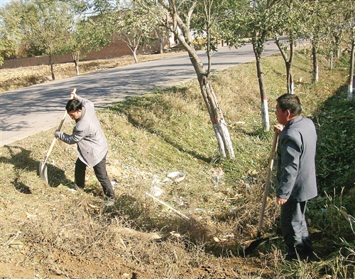 李進(jìn)禎(左一)生前帶領(lǐng)村民對鄉(xiāng)村環(huán)境綜合整治。 (資料圖片)