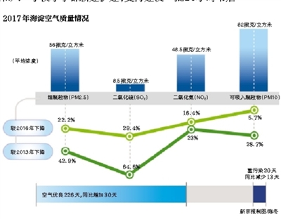 此外,2017年,海淀空氣質(zhì)量優(yōu)良天數(shù)為226天,占比全年62.3%,較2016年增加30天;重污染天數(shù)為20天,較2016年減少13天。
