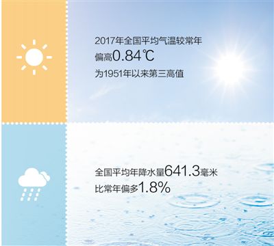 2017年,全國(guó)平均氣溫較常年偏高0.84℃,為1951年以來(lái)第三高值;四季氣溫均偏高,其中冬季為歷史同期最高。全國(guó)平均年降水量641.3毫米,比常年偏多1.8%。