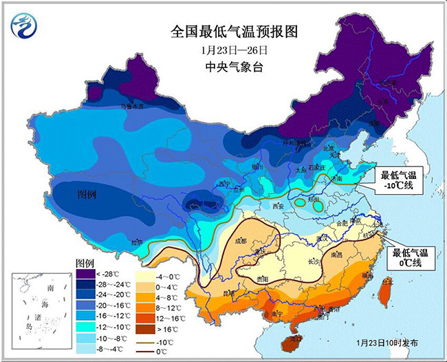 1月23日至月底,影響我國(guó)的冷空氣頻繁且勢(shì)力較強(qiáng)。23-26日,受強(qiáng)冷空氣影響,中東部大部地區(qū)自北向南先后有4~5級(jí)偏北風(fēng),陣風(fēng)6~7級(jí);黃淮及其以南地區(qū)氣溫下降6~8℃,部分降溫幅度可達(dá)10~12℃。在此期間,中東部大部地區(qū)日平均氣溫較常年同期偏低2~5℃,部分地區(qū)偏低6℃以上。最低氣溫0℃線(xiàn)將南壓至浙江北部、江西北部、湖南南部至貴州南部一線(xiàn),-10℃線(xiàn)位于甘肅東南部、陜西中部到河北南部、山東中部一線(xiàn)。我國(guó)東部和南部海區(qū)先后有6~8級(jí)、陣風(fēng)9~10級(jí)大風(fēng)。