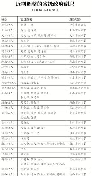 記者注意到,從1月16日開始的省級(jí)政府副職調(diào)整共涉及27省份,1月16日至24日這一批省級(jí)政府副職調(diào)整,共涉及23個(gè)省份,4大直轄市均有調(diào)整。26日至30日,經(jīng)過省級(jí)人大會(huì)議選舉,37位“本土派”副省長當(dāng)選。