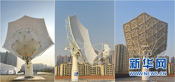 這是SKA——平方公里陣列射電望遠鏡首臺天線樣機的正面(左)、側(cè)面(中)和背面(2月6日攝,拼版照片)。新華社記者 牟宇 攝