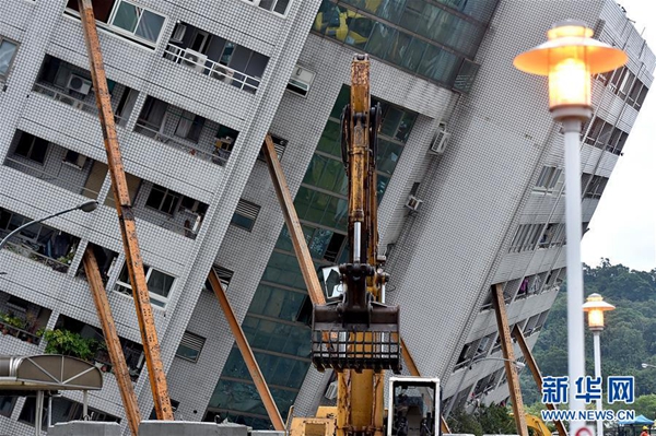 2月7日,救援人員用鋼架支撐傾倒的花蓮云門翠堤大樓。新華社記者 岳月偉 攝