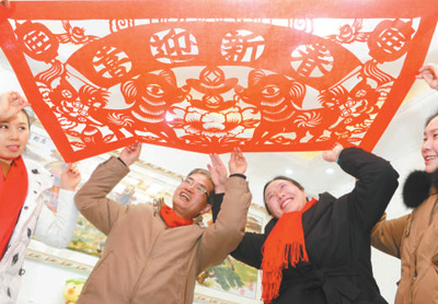 圖二 2月15日,在安徽省阜陽(yáng)市臨泉路白衣橋安置區(qū)內(nèi),安置戶董杰珍(前一)和當(dāng)?shù)丶艏埶囆g(shù)家一起將喜慶窗花張貼到窗戶上。王彪 攝(人民視覺(jué))