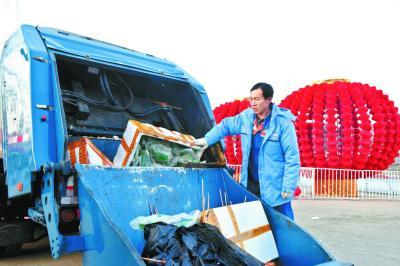 昨天,龍?zhí)洞汗?jié)文化廟會(huì)即將結(jié)束,李國(guó)棟將一堆堆的廟會(huì)垃圾裝進(jìn)垃圾車,這個(gè)春節(jié)的每一天他都是在這樣的勞作中度過的。 本報(bào)記者和冠欣攝