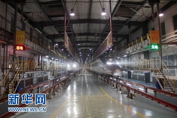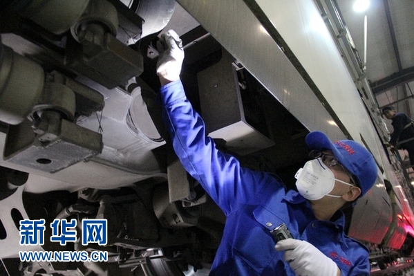 石家莊動(dòng)車(chē)運(yùn)用所的檢修工正在作業(yè)。新華網(wǎng) 金佳緒 攝