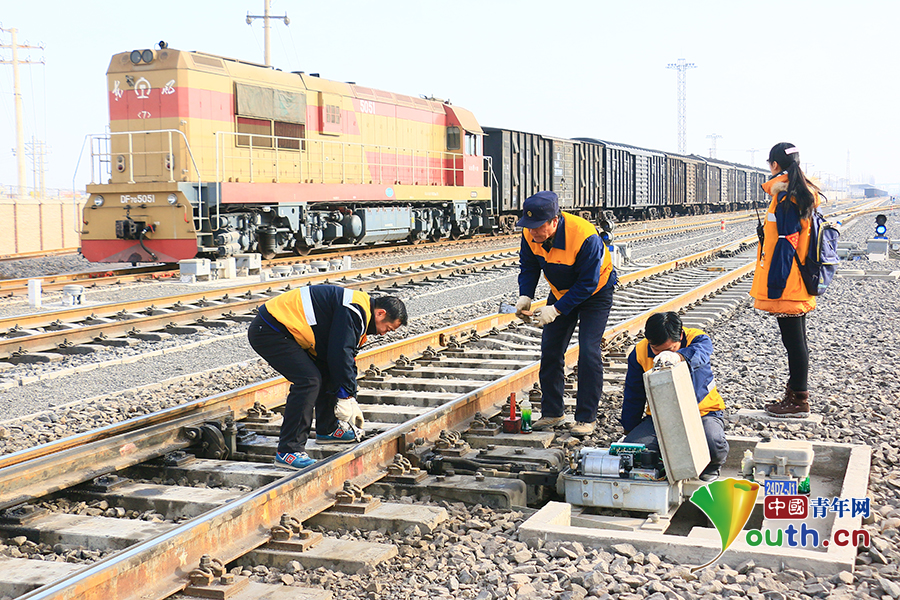 農(nóng)歷正月初八這天,邰芳鵬和工區(qū)3名年輕職工一同到現(xiàn)場,對阿克蘇站信號機(jī)和道岔進(jìn)行巡視檢查。中國青年網(wǎng)通訊員 姚旭東 攝