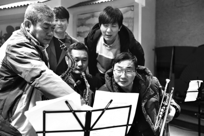 在馬莊村文化禮堂,農(nóng)民樂團(tuán)的成員在排練時(shí)討論樂譜。新華社發(fā)