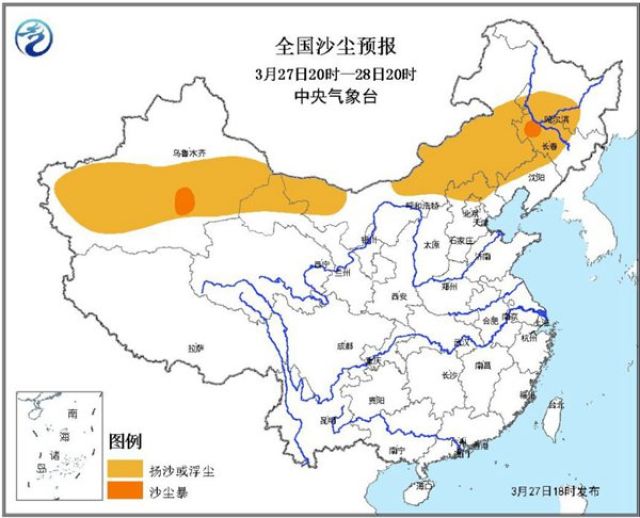 中央氣象臺3月27日18時繼續(xù)發(fā)布沙塵暴藍色預(yù)警: