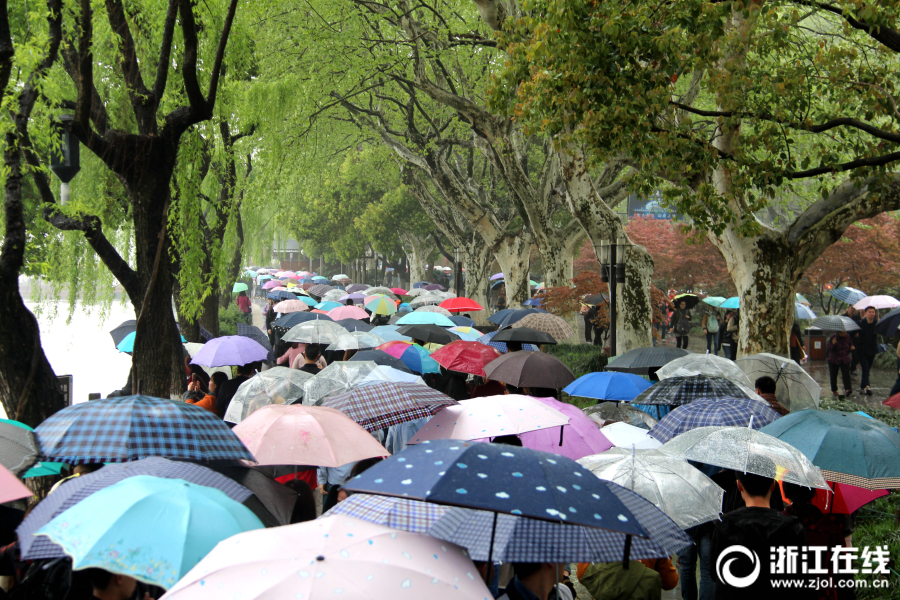 4月5日,清明小長假首日,杭州細(xì)雨綿綿,西湖景區(qū)游客絡(luò)繹不絕。杭城雖降雨降溫,但西湖景區(qū)前來賞花踏青的游客如潮,斷橋似人橋。(浙江在線拍友 里爾 柱子 攝)