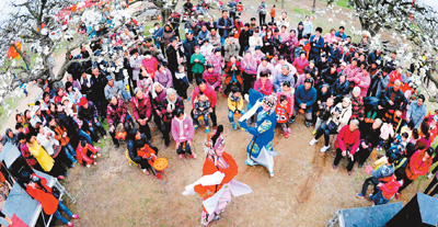 4月7日,安徽碭山縣迎來百萬畝梨花盛開,當?shù)乩孓r(nóng)組織吹嗩吶、唱大戲、斗羊等傳統(tǒng)民俗表演,祈盼酥梨豐收。韓俊杰 王嫣 攝影報道